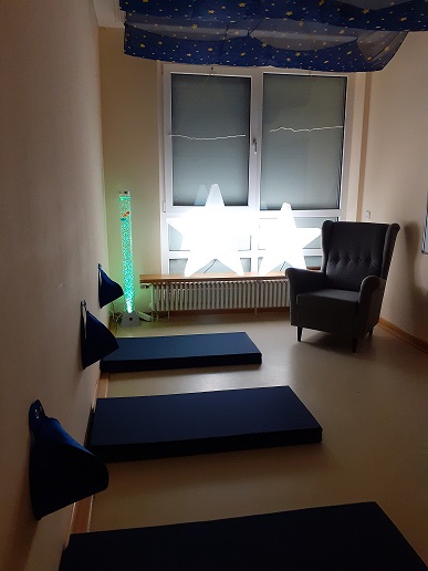 Für die Zweijährigen aus der Gruppenform I (Kinder im Alter zwischen zwei und sechs Jahren) wurde ein separater Schlafraum eingerichtet. Dort können die Jüngsten aus der Gruppe in Ruhe schlafen, während die anderen Kinder im Gruppenraum weiterspielen, ohne Rücksicht auf die jüngeren Kinder nehmen zu müssen.